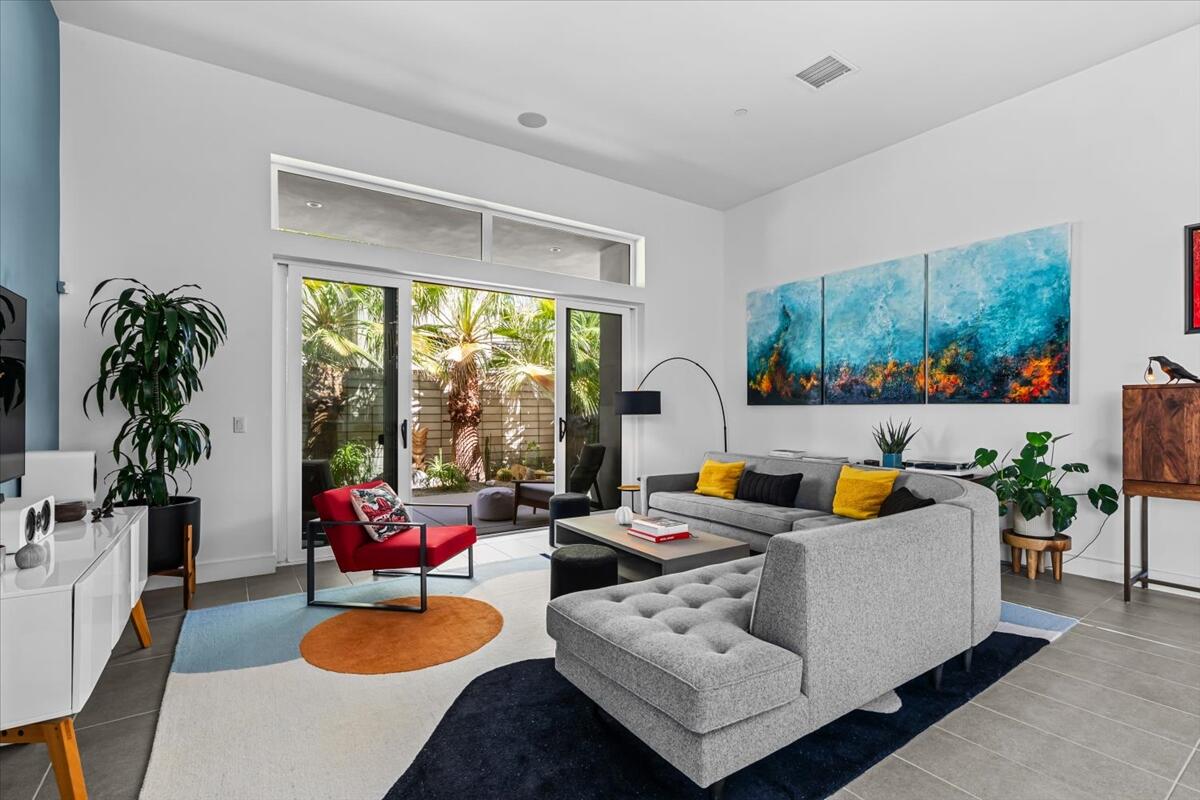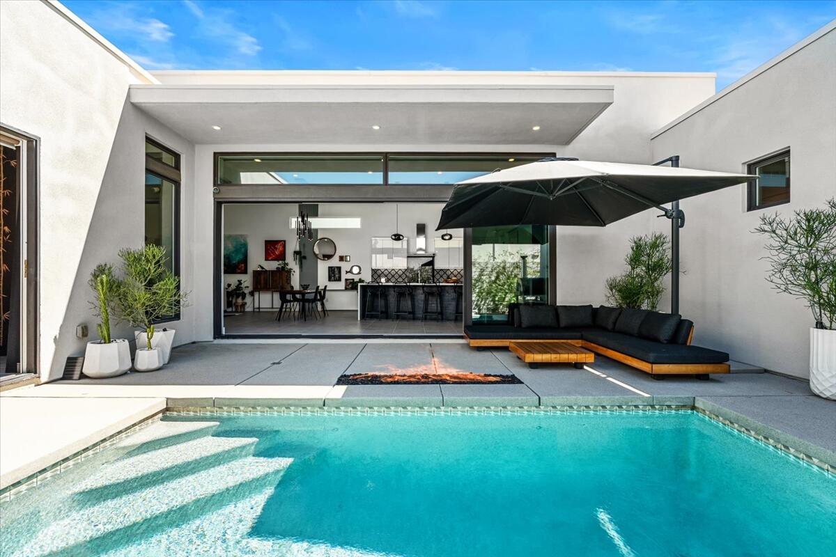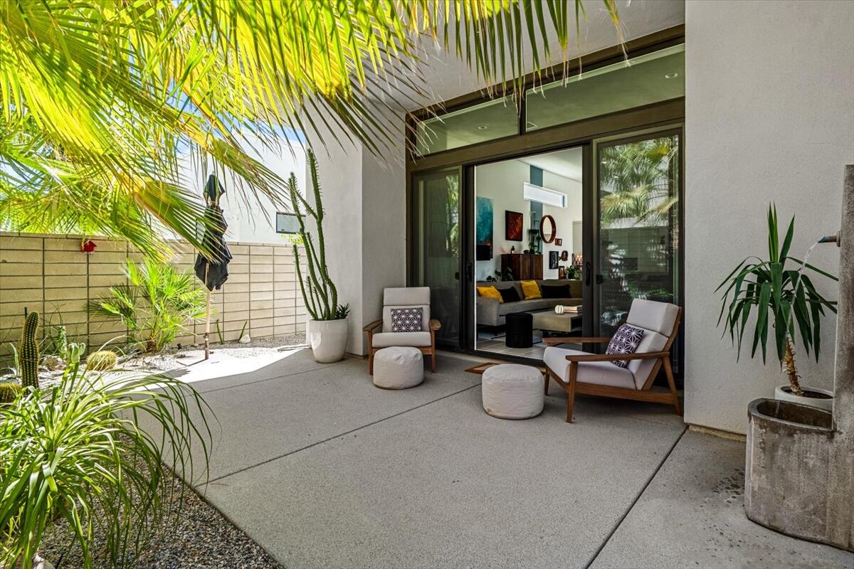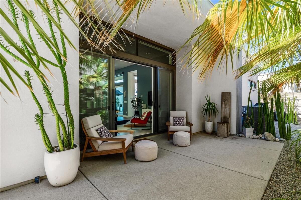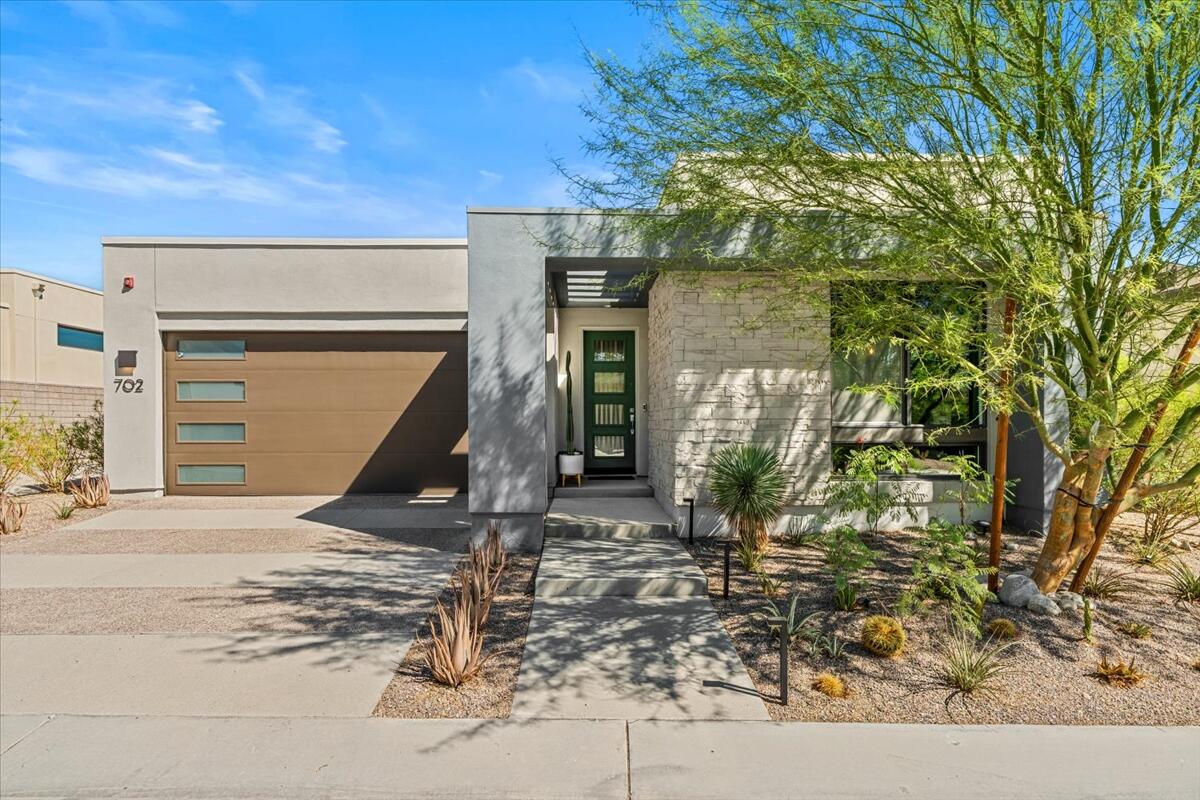 Live the Miralon lifestyle at 702 Fountain Dr, a fully furnished and move-in-ready 3BD/3.5BA modern residence located in one of Palm Springs' most desirable gated communities. This turn-key Model Aura Residence 2B features 2,084 sq ft of interior space on a 5,662 sq ft lot, blending mid-century inspiration with contemporary design.The interiors reflect thoughtful creative touches, including custom designer wallpapers, a flex bedroom/offices, a sleek kitchen with modern finishes, and a dramatic primary suite with upgraded sliding doors opening to the private backyard. The great room features a sliding glass wall that frames mountain views and creates seamless indoor-outdoor flow.Energy-efficient and tech-forward features include solar panels with two Tesla Powerwall batteries, a whole-house water filtration and softener system with reverse osmosis, zoned HVAC with smartphone control, smart garage door and entry systems, cameras, automatic window shades, and a full-home audio system.The private outdoor space offers a pool, gas fire feature, luxury seating, palms, a fountain, and added privacy and mountain views from the lot's setback. Miralon amenities include miles of walking trails, over 7,000 olive trees, a cafe and bar, fitness center, dog parks, community garden, mountain views, and direct access to CV Link, Coachella Valley's new bike, pedestrian and golf cart throughway.