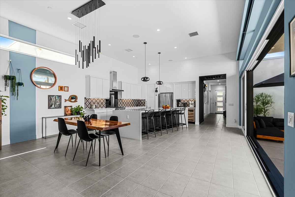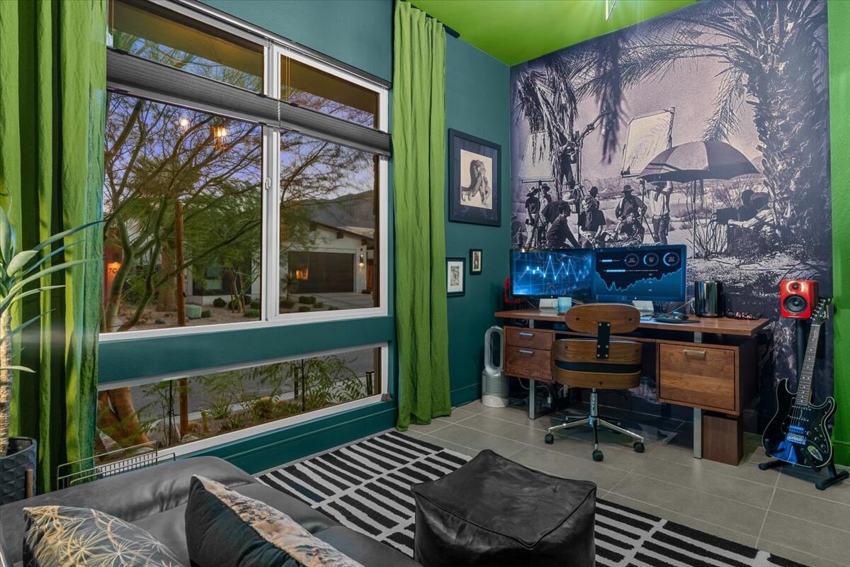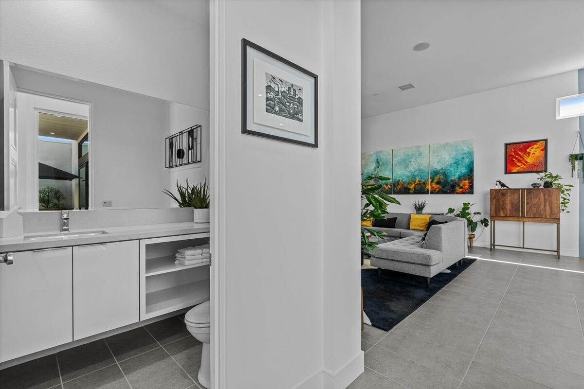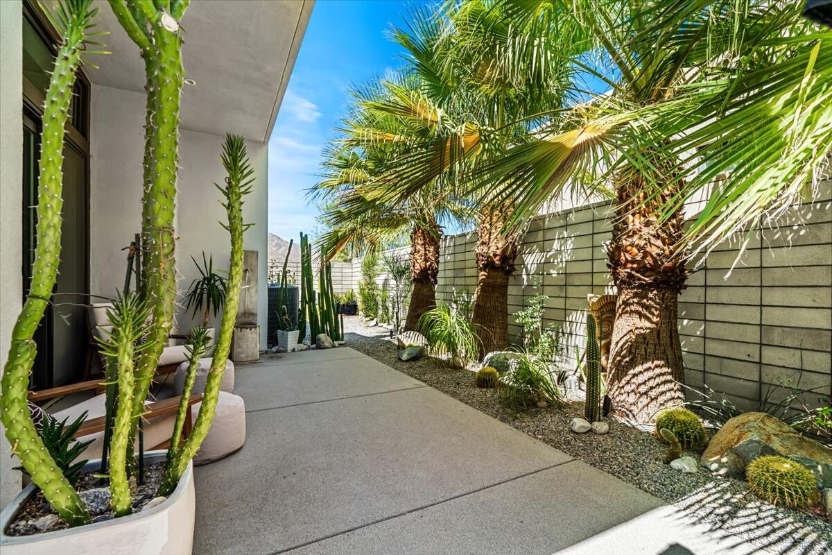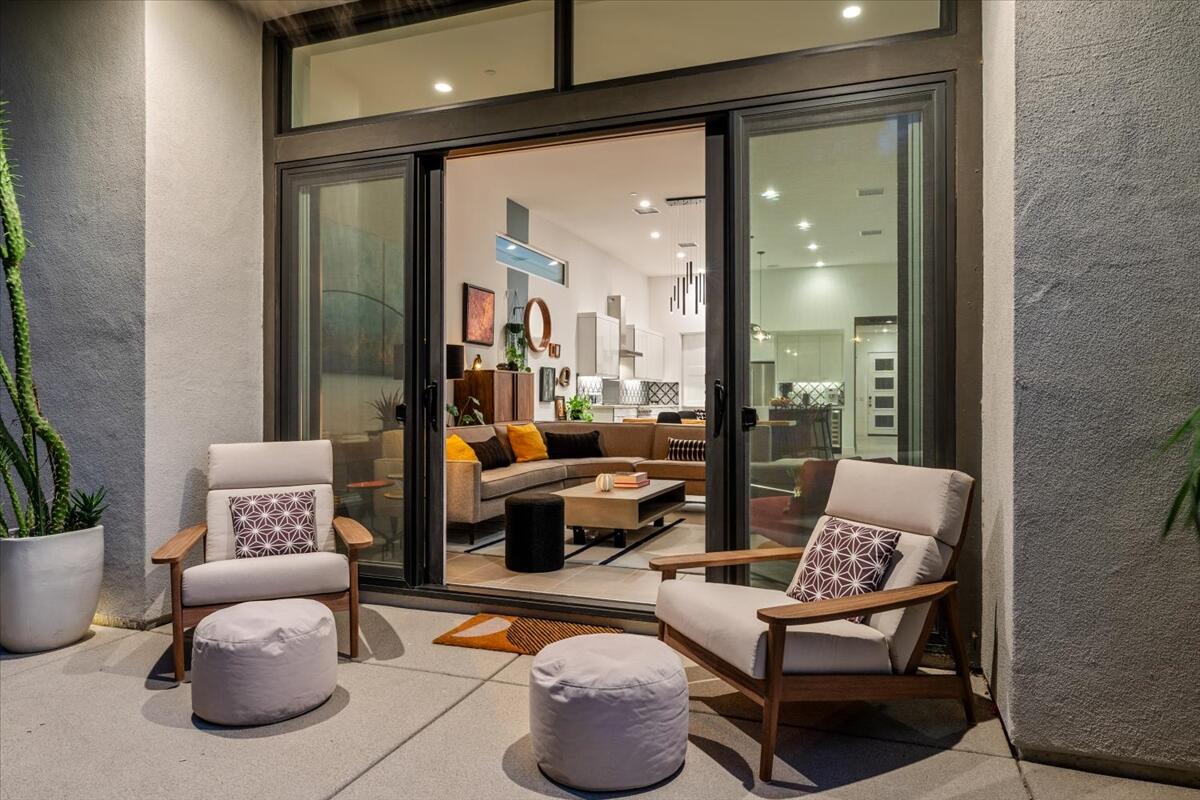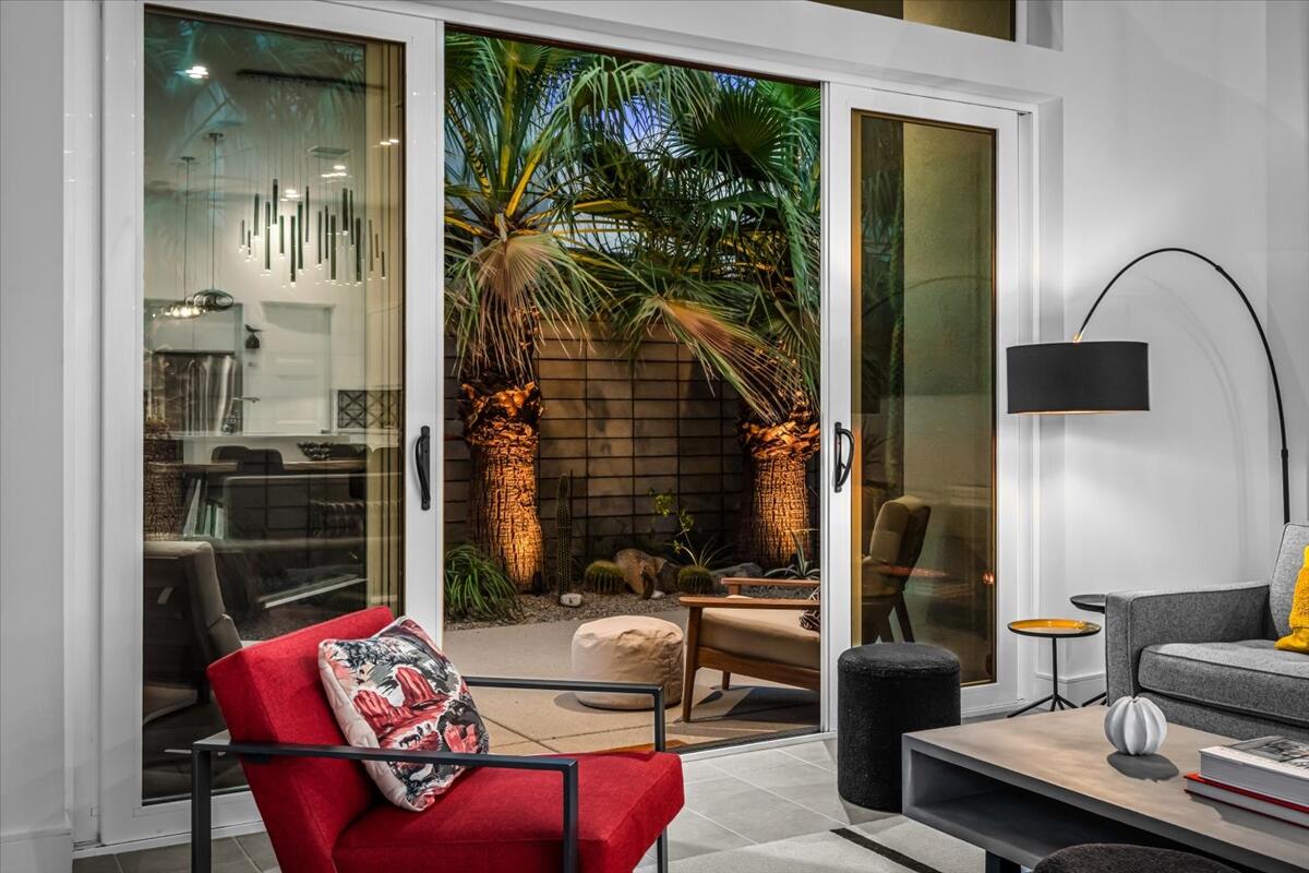 Live the Miralon lifestyle at 702 Fountain Dr, a fully furnished and move-in-ready 3BD/3.5BA modern residence located in one of Palm Springs' most desirable gated communities. This turn-key Model Aura Residence 2B features 2,084 sq ft of interior space on a 5,662 sq ft lot, blending mid-century inspiration with contemporary design.The interiors reflect thoughtful creative touches, including custom designer wallpapers, a flex bedroom/offices, a sleek kitchen with modern finishes, and a dramatic primary suite with upgraded sliding doors opening to the private backyard. The great room features a sliding glass wall that frames mountain views and creates seamless indoor-outdoor flow.Energy-efficient and tech-forward features include solar panels with two Tesla Powerwall batteries, a whole-house water filtration and softener system with reverse osmosis, zoned HVAC with smartphone control, smart garage door and entry systems, cameras, automatic window shades, and a full-home audio system.The private outdoor space offers a pool, gas fire feature, luxury seating, palms, a fountain, and added privacy and mountain views from the lot's setback. Miralon amenities include miles of walking trails, over 7,000 olive trees, a cafe and bar, fitness center, dog parks, community garden, mountain views, and direct access to CV Link, Coachella Valley's new bike, pedestrian and golf cart throughway.
