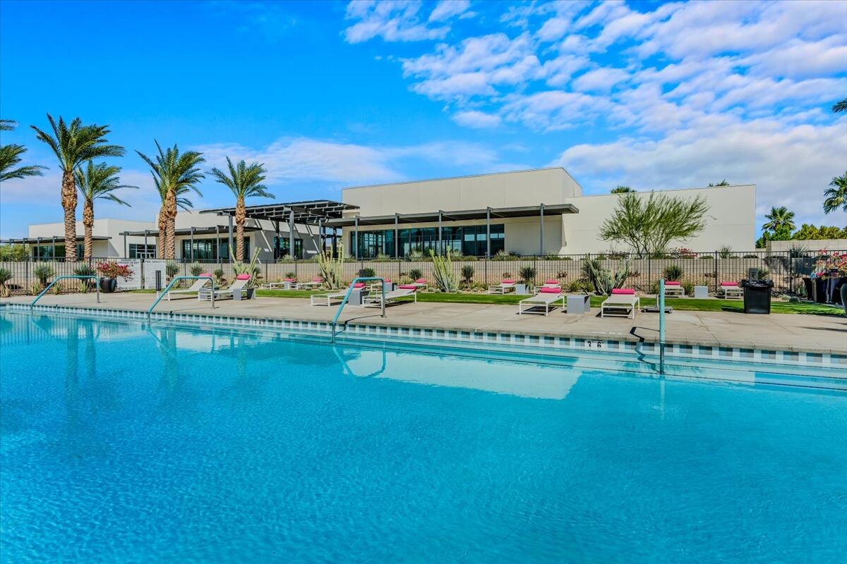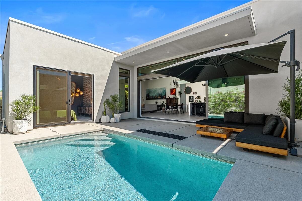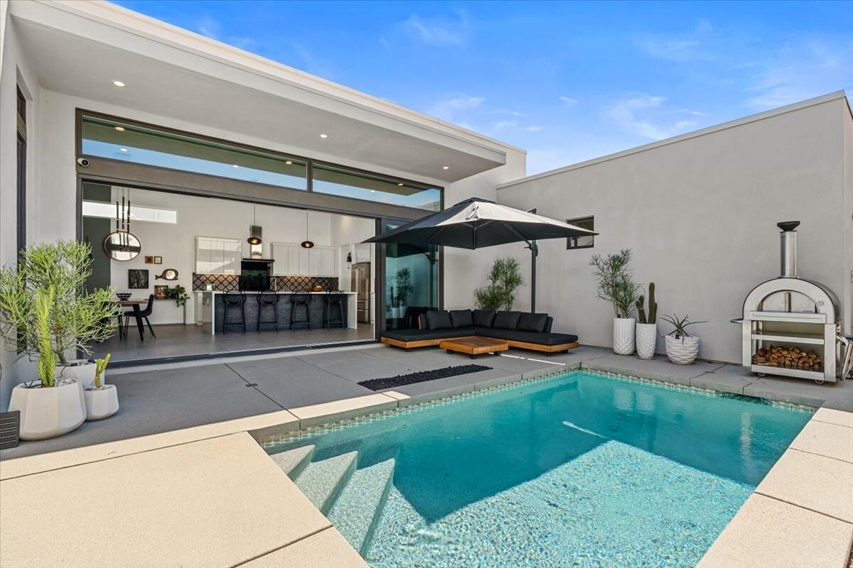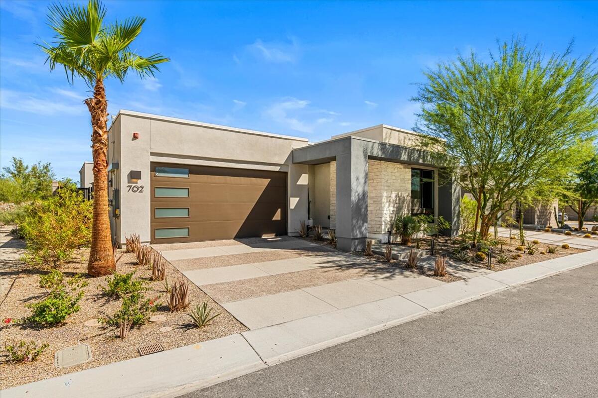 Welcome to 702 Fountain Dr: a one-of-a-kind 3BD/3.5BA home in the gated Miralon community, where mid-century modern flair meets resort-style living. This fully-furnished, turn-key Model Aura Residence 2B spans 2,084 sq ft and sits on a 5,662 sq ft lot.Every inch of this home has personality imbued by its Disney designer owner: from the custom peacock and panther wallpaper to the modern abstract desert hallway mural and a bedroom/office outfitted as a recording studio. The sleek kitchen features a tempered glass and bespoke backsplash, updated hardware, and a reverse osmosis water system. The dramatic ''Jungle Room'' primary suite includes an upgraded sliding door that opens to the private backyard, and the great room features a sliding glass wall with views of the mountains and access to the pool.Energy-efficient and tech-forward, the home features solar panels with two Tesla Powerwall batteries, whole house water softener and filter system, zoned HVAC with smartphone control, as well as smartphone controlled garage door opener and front door lock, front door and other cameras, automatic window shades, and a full-home sound system.Outside, enjoy your own pool, gas fire feature, wood-fired pizza oven, luxury outdoor sectional and tranquil landscaping with palms, a fountain, and added privacy from the lot's easement distance from your neighbors. The front door faces South, a thoughtful detail for those who appreciate orientation and natural light flow.Located in highly desirable Miralon, the community offers miles of walking trails, olive groves with over 7000 trees, a you-pick herb and vegetable garden, clubhouse with cafe and bar, well-appointed fitness center, and for bicyclists nearby access to the new CV Link, as well as breathtaking mountain views -- desert living at its coolest. Miralon has 2 dog parks, with one more currently being built.