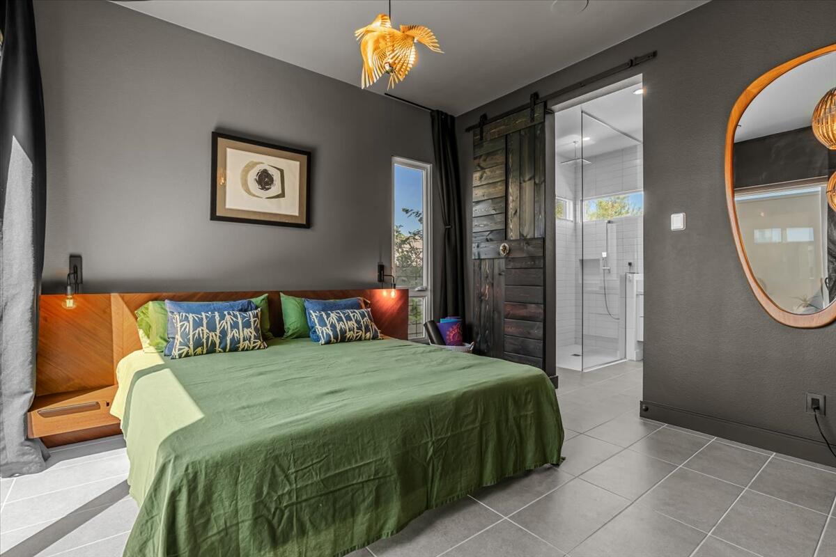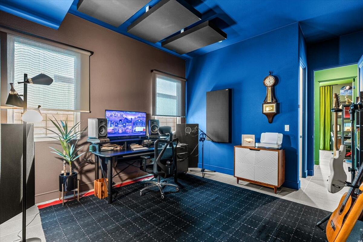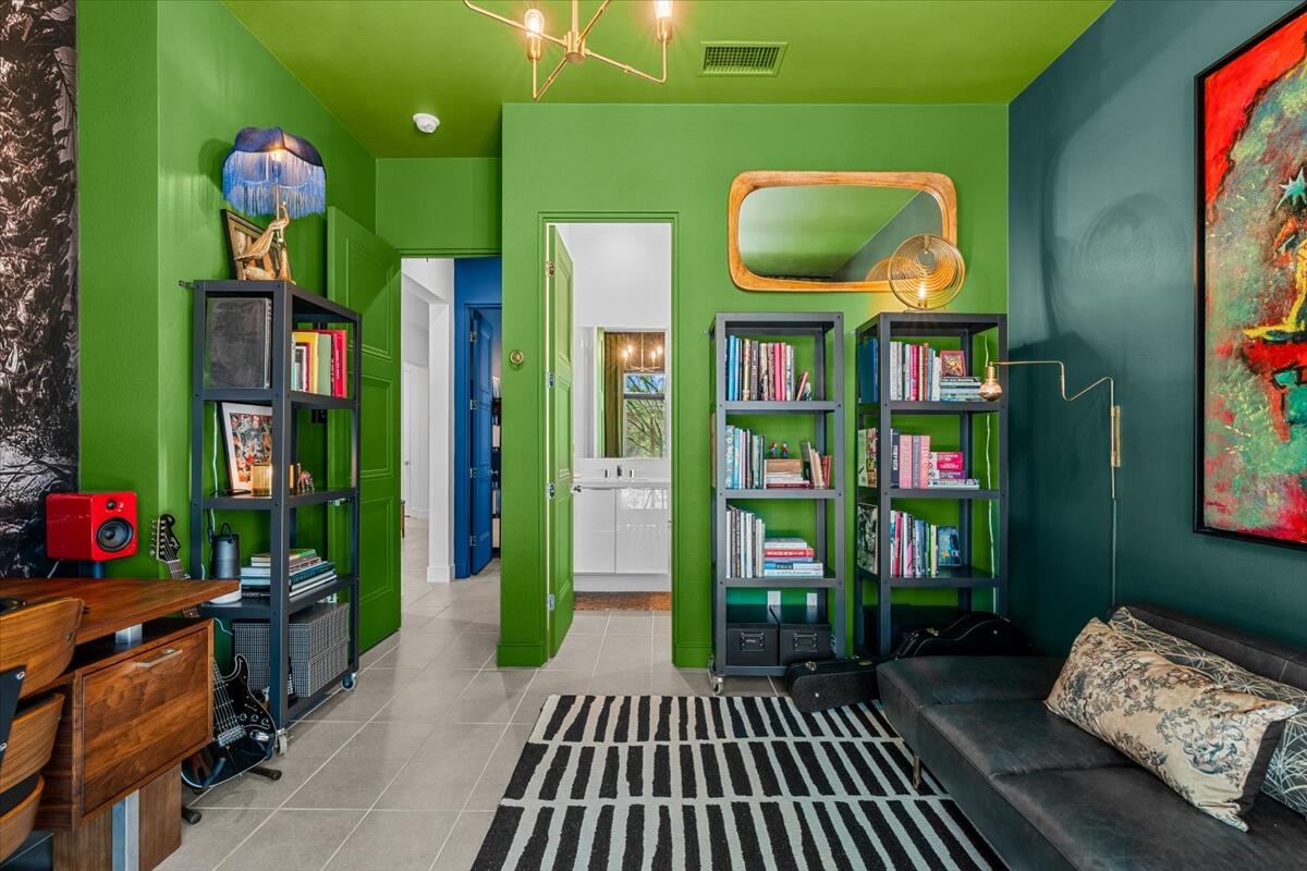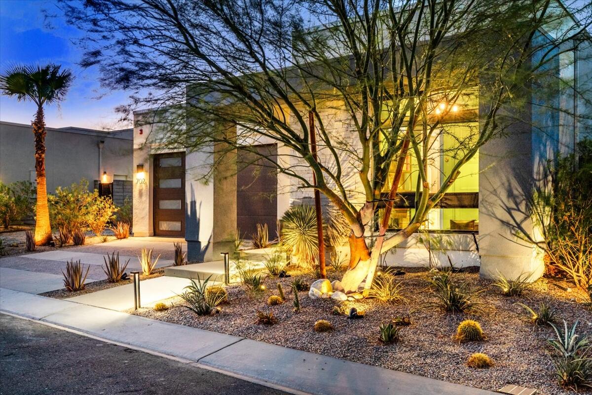 Welcome to 702 Fountain Dr: a one-of-a-kind 3BD/3.5BA home in the gated Miralon community, where mid-century modern flair meets resort-style living. This fully-furnished, turn-key Model Aura Residence 2B spans 2,084 sq ft and sits on a 5,662 sq ft lot.Every inch of this home has personality imbued by its Disney designer owner: from the custom peacock and panther wallpaper to the modern abstract desert hallway mural and a bedroom/office outfitted as a recording studio. The sleek kitchen features a tempered glass and bespoke backsplash, updated hardware, and a reverse osmosis water system. The dramatic ''Jungle Room'' primary suite includes an upgraded sliding door that opens to the private backyard, and the great room features a sliding glass wall with views of the mountains and access to the pool.Energy-efficient and tech-forward, the home features solar panels with two Tesla Powerwall batteries, whole house water softener and filter system, zoned HVAC with smartphone control, as well as smartphone controlled garage door opener and front door lock, front door and other cameras, automatic window shades, and a full-home sound system.Outside, enjoy your own pool, gas fire feature, wood-fired pizza oven, luxury outdoor sectional and tranquil landscaping with palms, a fountain, and added privacy from the lot's easement distance from your neighbors. The front door faces South, a thoughtful detail for those who appreciate orientation and natural light flow.Located in highly desirable Miralon, the community offers miles of walking trails, olive groves with over 7000 trees, a you-pick herb and vegetable garden, clubhouse with cafe and bar, well-appointed fitness center, and for bicyclists nearby access to the new CV Link, as well as breathtaking mountain views -- desert living at its coolest. Miralon has 2 dog parks, with one more currently being built.